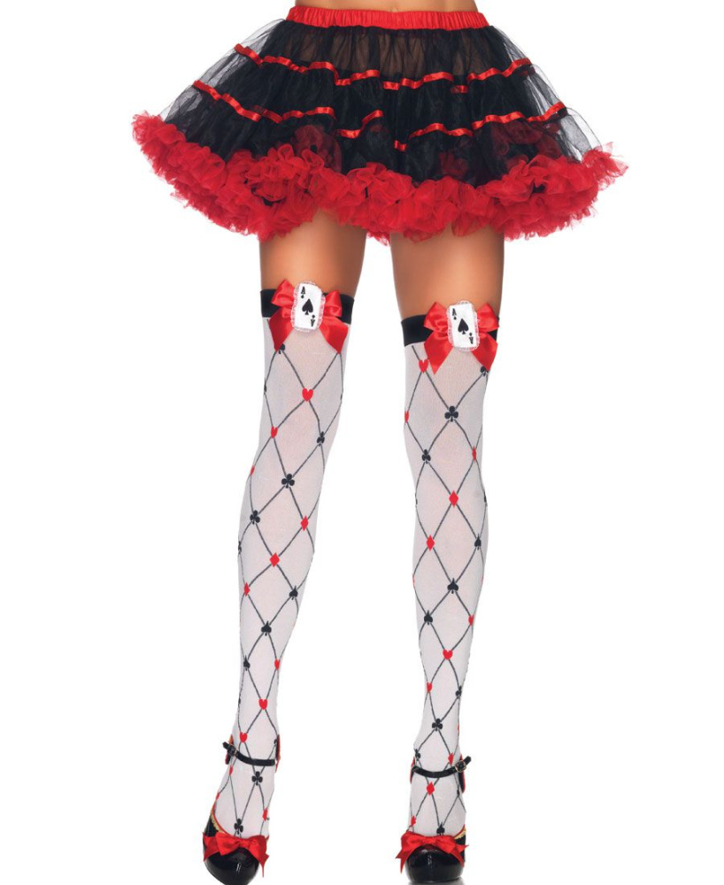 Белые чулки с узором карточных мастей украшены красными бантами и картами, заостряющими внимание на их обладательнице. Чулочки можно носить без пояса – кайма белья не слишком широкая, но эластичная.