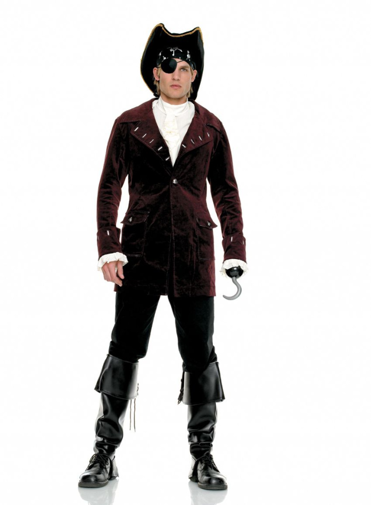 В комплект входят: бархатный пиджак, рубашка, крюк, повязка на глаз, головной убор и верхняя кожаная часть на ботинки. В комплекте: пиджак, рубашка, крюк, повязка на глаз, головной убор, кожаные накладки на ботинки.