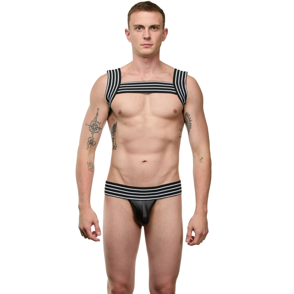 Мужской костюм «Гладиатор». Состоит и 2 предметов в полоску: портупеи и трусиков-джоки. В комплекте: портупея, трусики-джоки.