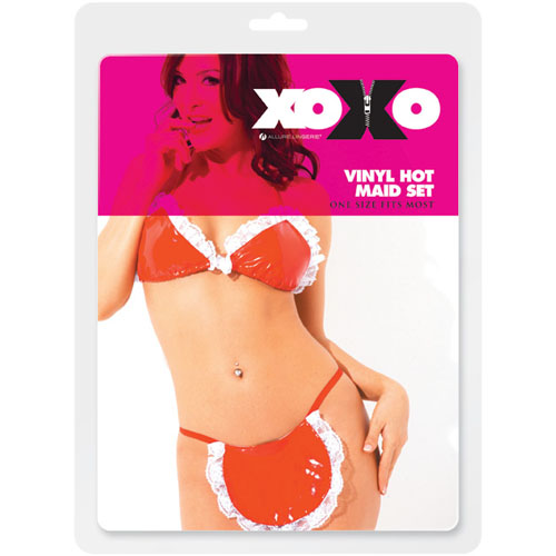 Эротический костюмчик горничной из винила с окаймляющим белым кружевом. Костюм состоит из лифа, который завязывается на спине и на шее, и трусиков-стрингов с фартучком спереди. В комплекте: лиф, трусики-фартук.