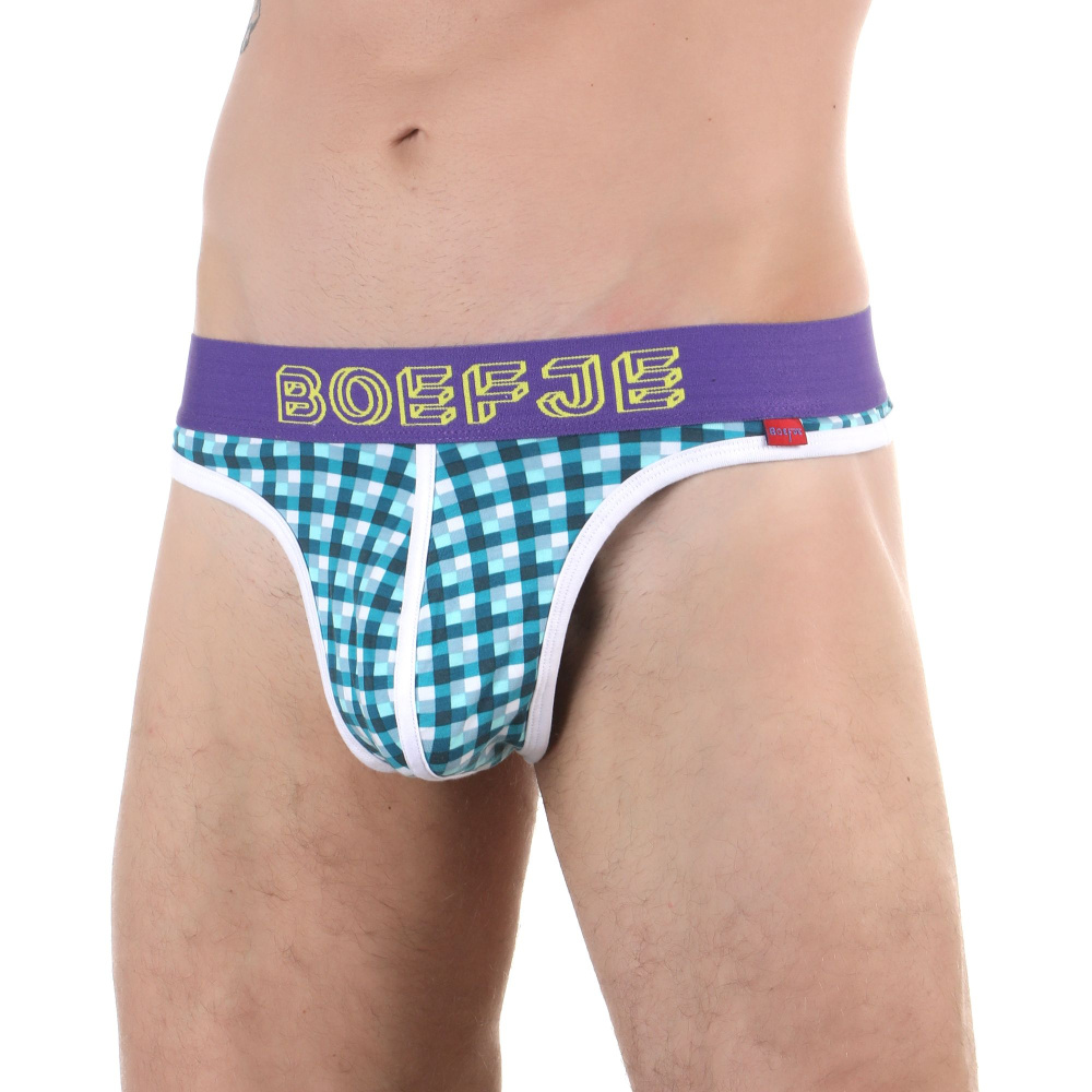 Купить Бирюзовые клетчатые трусы-тонги с брендированным поясом Boefje по лучшей цене с доставкой - секс-шоп Ynunu.ru