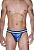 Блестящие мужские гладкие трусы-тонги насыщенного синего цвета, на широкой резинке в полоску.