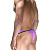 Трусы-танга двухцветные, в которых скомбинированы кружевной ярко-фиолетовый пояс и кружевная задняя часть трусов с лаковым гладким блестящим черным материалом в районе мошонки.