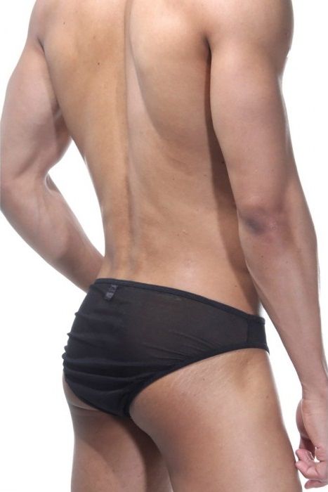 Черно-розовые слипы для мужчин с низкой посадкой. На ягодицах и по бокам полупрозрачная черная тонкая ткань, а спереди бледно-розовая вставка из кружева.