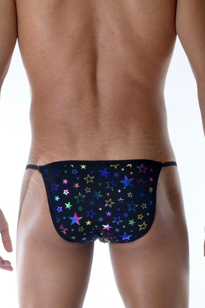 Черные мужские трусы-танга с разноцветными блестящими звездами.