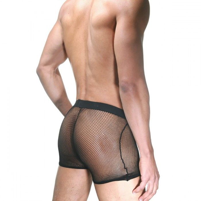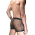 Мужские боксеры черного цвета, из тонкой хорошо тянущейся сетки. Спереди непрозрачная вставка с красными элементами.