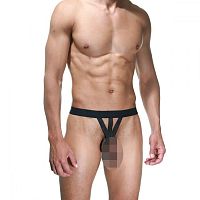 Черные трусы-танга для мужчин с низкой посадкой, на широкой резинке. Спереди розовая небольшая рюша.