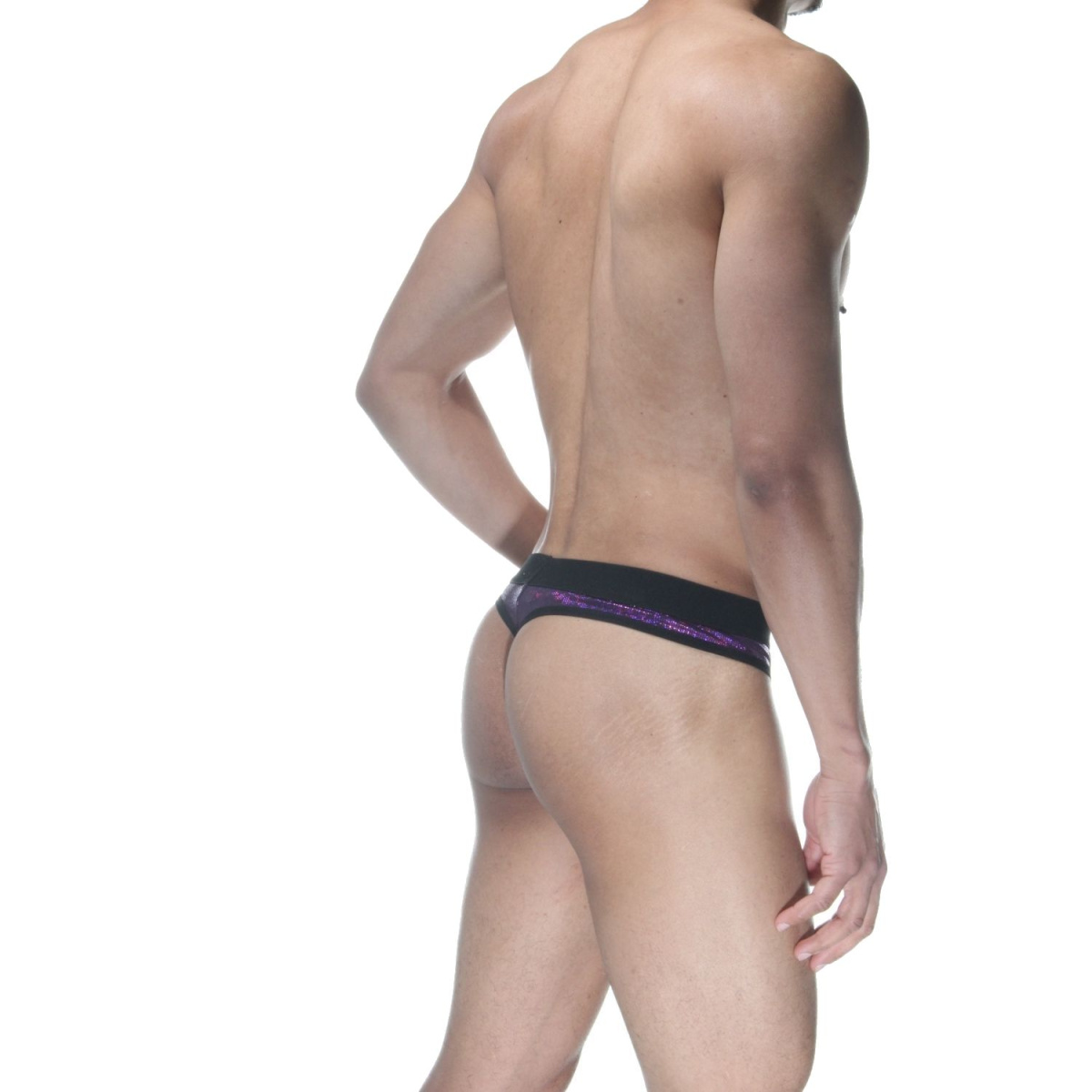 Фиолетовые блестящие мужские трусы-стринги.
