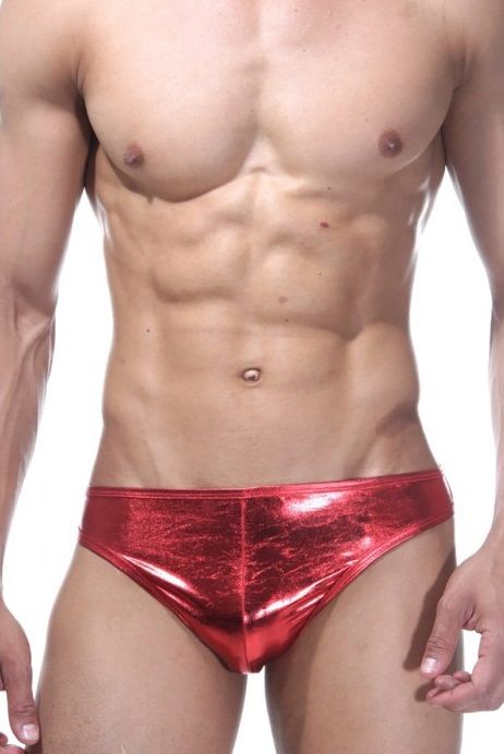 Красные трусы-джоки из блестящего гладкого материала. Спереди абсолютно гладкие, сзади открытые ягодицы.