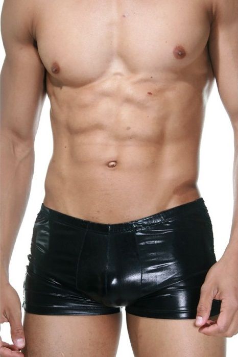 Мужские черные боксеры из гладкого блестящего материала, с низкой посадкой. По бокам вставки из ажурного кружевного полупрозрачного материала.