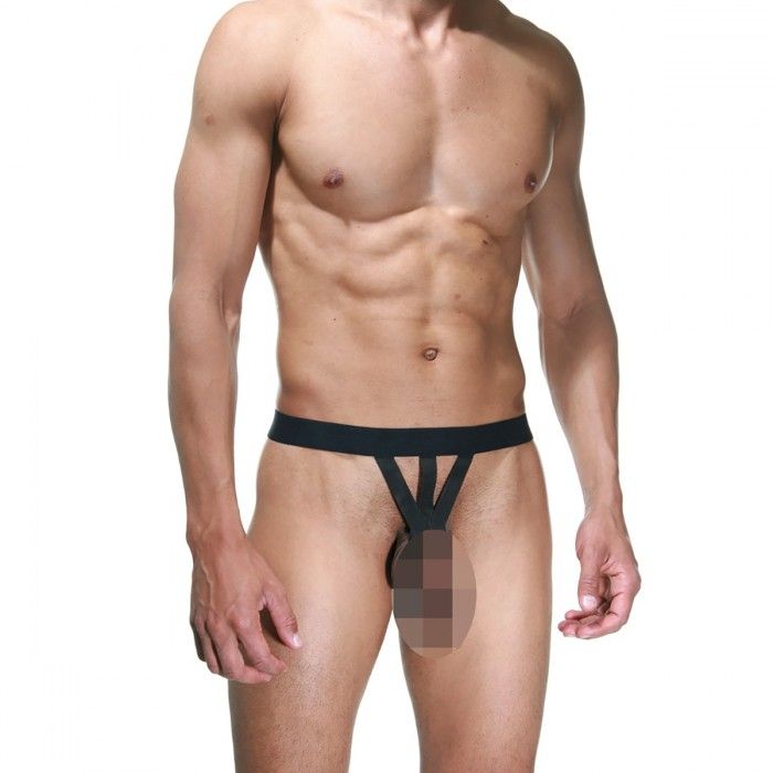 Черные очень откровенные трусы, на широком поясе, из ремешков, с полностью открытыми ягодицами и гениталиями.