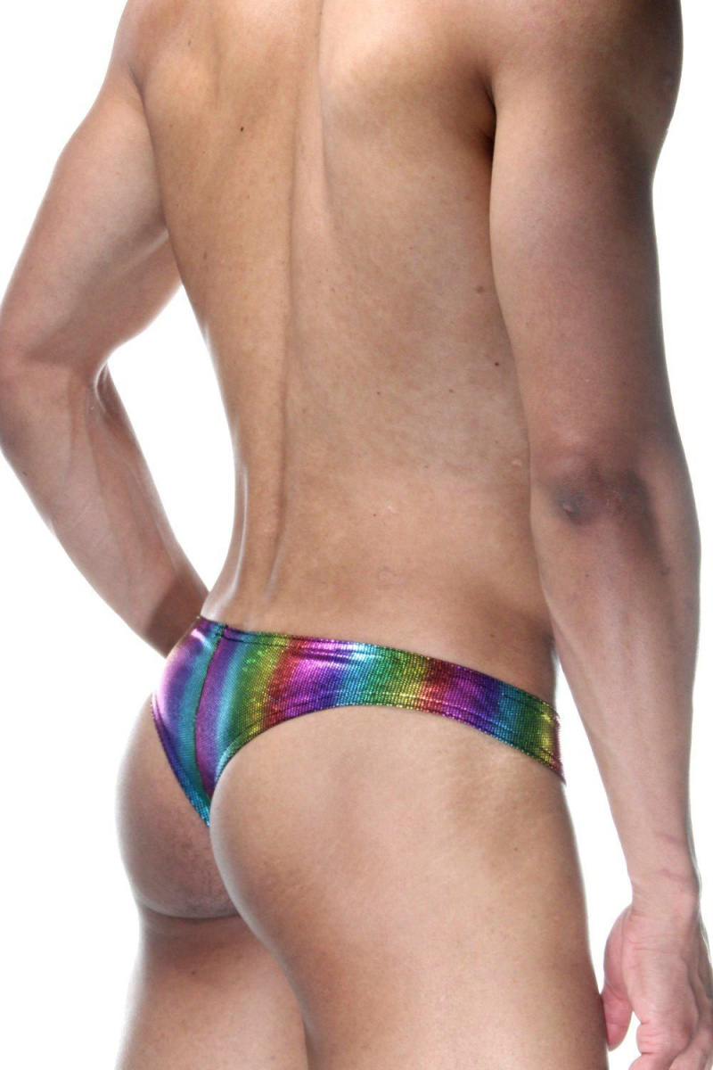 Мужские радужные трусы-бразилиана из ткани с блеском.