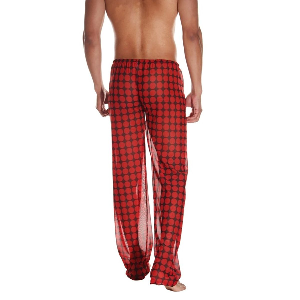 Свободные штаны из легкой полупрозрачной ткани в крупный красный горох.