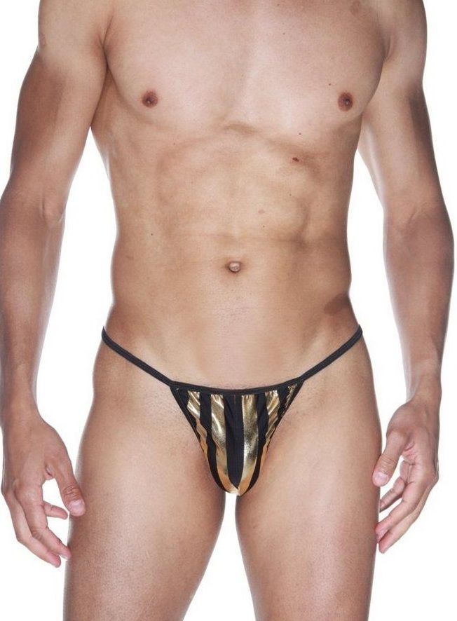 Мужские трусы-стринги из черной ткани в широкую золотую полоску