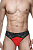 Мужские трусы-танга из черного кружева, с ярко-красной, гладкой вставкой спереди.