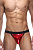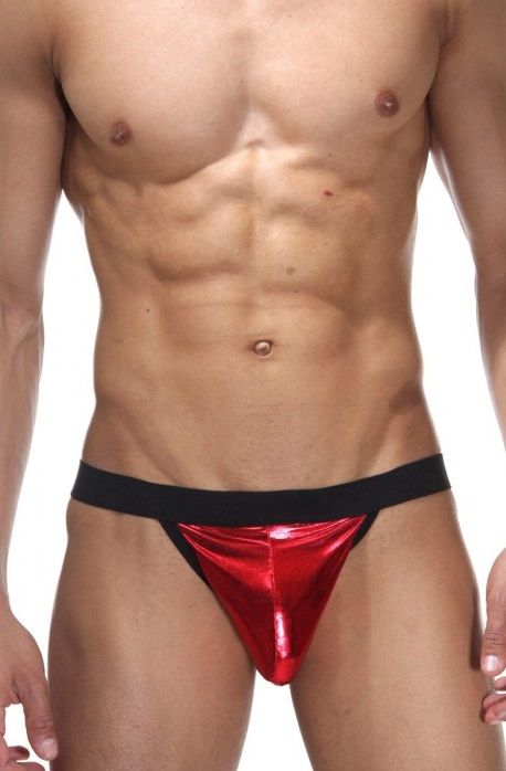 Гладкие блестящие красные стринги на широкой черной эластичной резинке, с низкой посадкой.