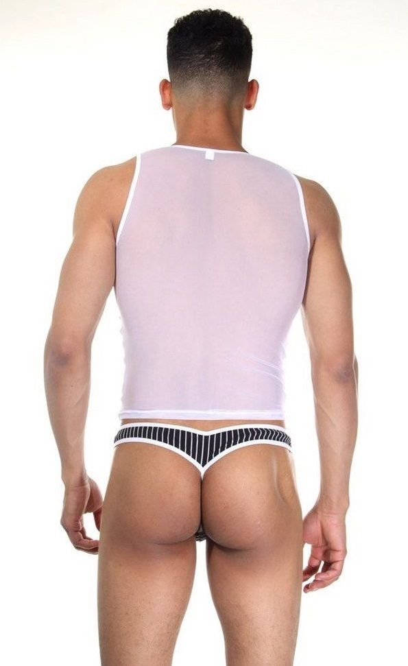 Комплект из трусиков черного цвета, в тонкую белую полоску, с белой оторочкой и майкой, у которой плечи в тон стрингам из черно-белого материала, а сама майка из полупрозрачного белого материала. В комплекте: майка, трусики-стринги.