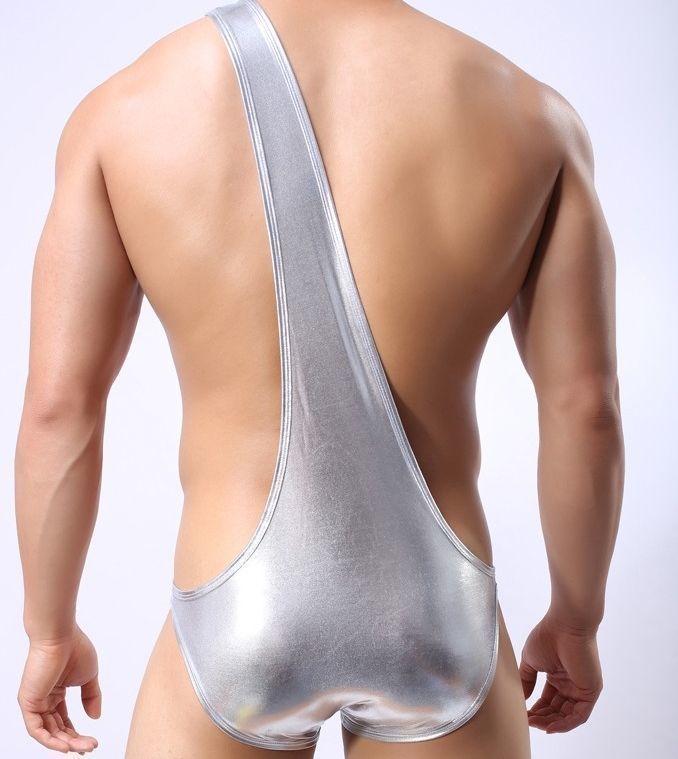 Серебристые мужские трусы с плечевой бретелью.