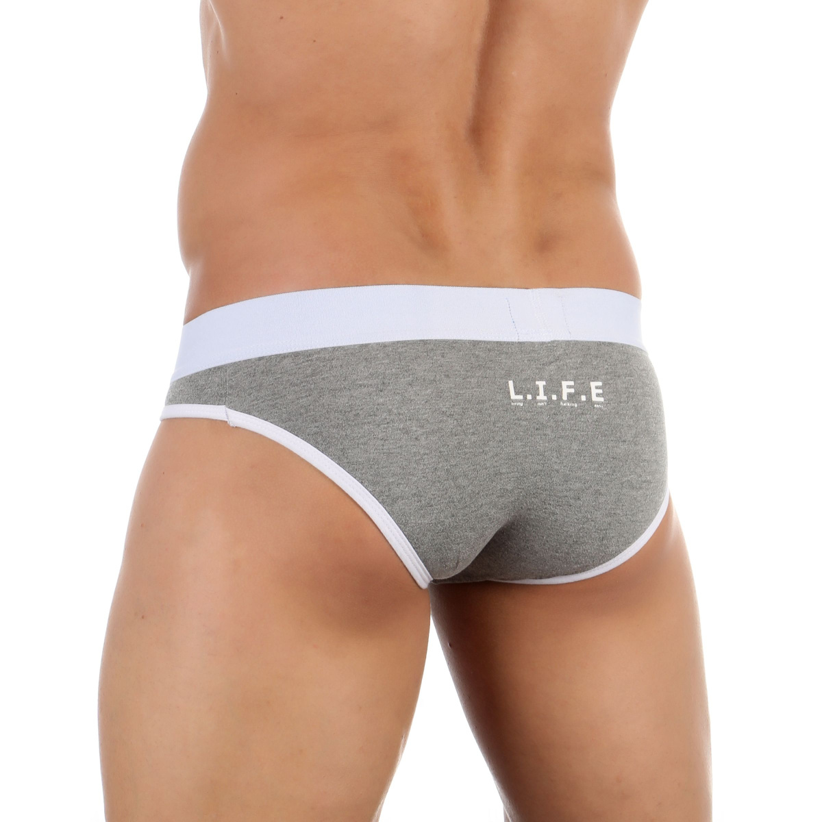 Серые мужские трусы-слипы L.I.F.E. Сзади надпись L.I.F.E. с расшифровкой - Living Isn’t F*cking Easy.