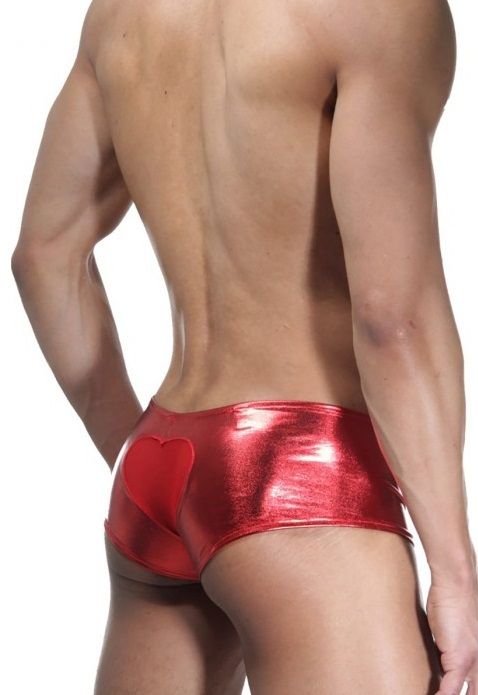 Ярко-красные трусы-хипсы из гладкого блестящего материала. Сзади на ягодицах декор-сердце.