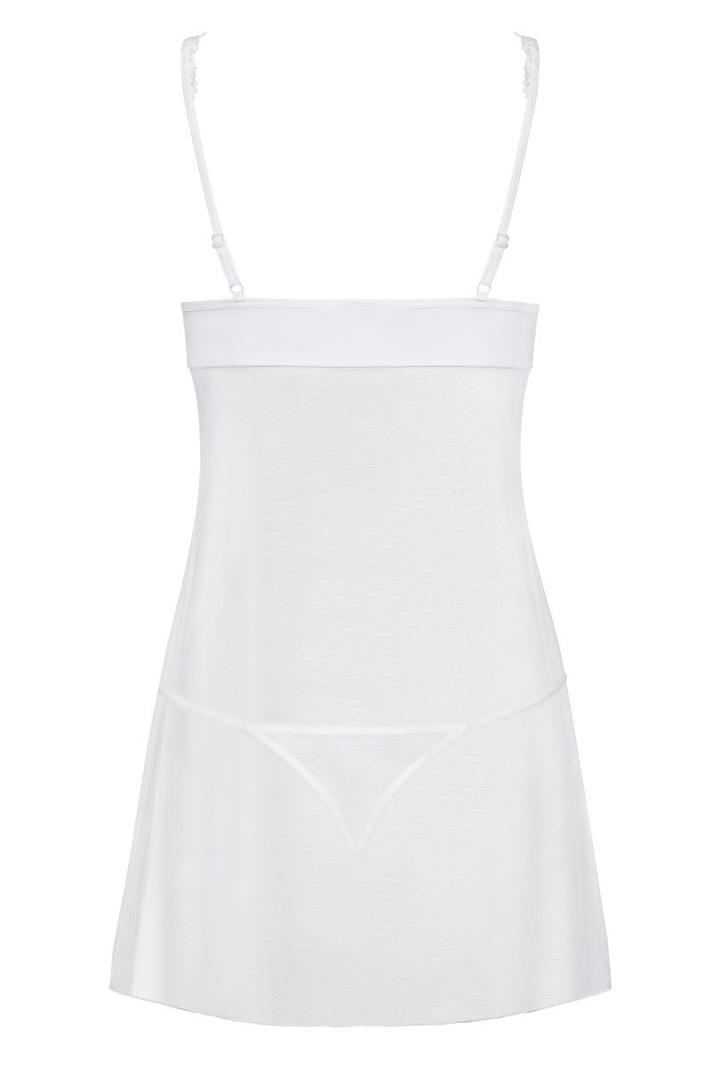Полупрозрачная сорочка с расклешенным силуэтом, широкие бретели, зона декольте и вставка спереди украшены вышивкой с цветочным рисунком. Чашка мягкая, без косточки. В комплект входят трусики стринги. В комплекте: бэби-долл, трусики-стринги.