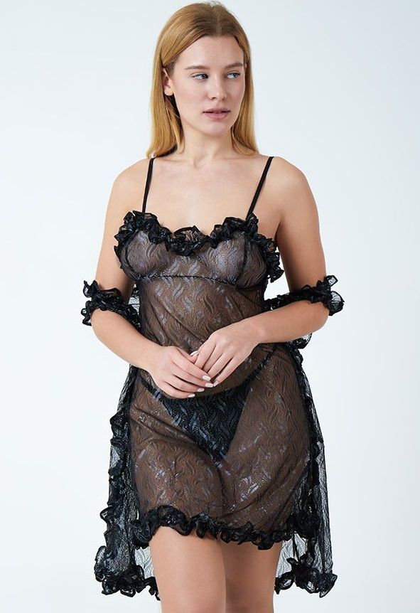 Соблазнительный комплект из сорочки на тонких бретельках, трусиков-стринг и свободной накидки. Выполнена из эластичного черного кружева с вкраплением серебряных нитей. Белье обработано феромонами. В комплекте: сорочка, накидка, трусики-стринги.