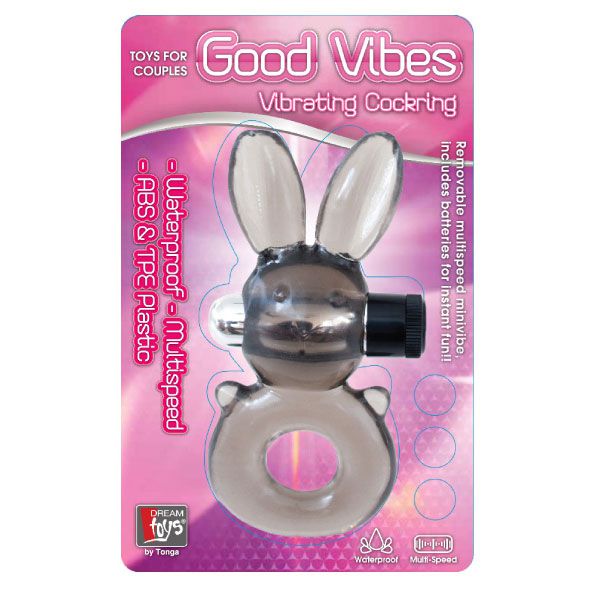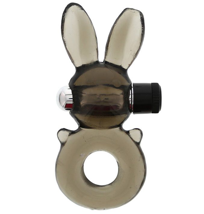 Дымчатое эрекционное кольцо-заяц с вибрацией. Вибропуля гарантирует чувственную стимуляцию клитора. Кольцо водонепроницаемо, отлично растягивается. Батарейки в комплекте.