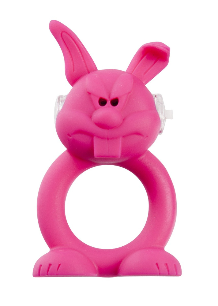 Виброкольцо на пенис с клиторальным стимулятором в виде зайца. Во время вибрации загораются красные глаза зверя. Работает от 2 дисковых батареек (входят в комплект).