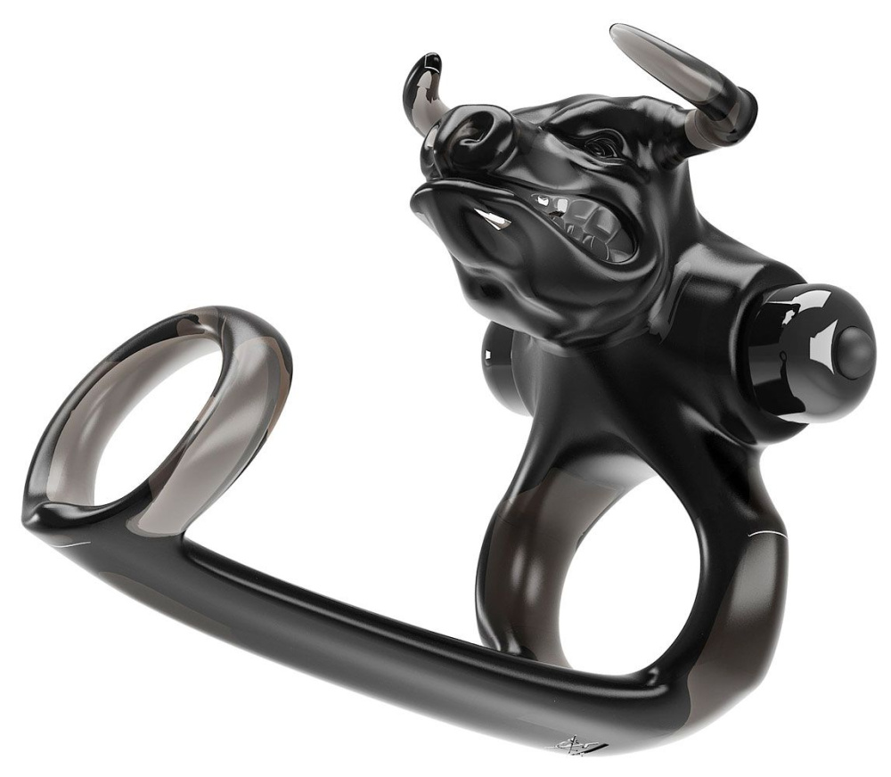 Насадка на пенис с вибратором для клитора в виде головы быка и дополнительным кольцом под головку. Имеет 10 режимов вибрации. Диаметр колец - 2,8 и 3,5 см.