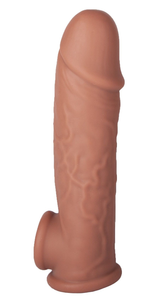 Коричневая удлиняющая насадка с отверстием для мошонки выполнена из приятного на ощупь силикона. Имеет реалистичную форму и богатый рельеф поверхности. Хорошо растягивается и плотно облегает. Рабочая длина - 10 см.