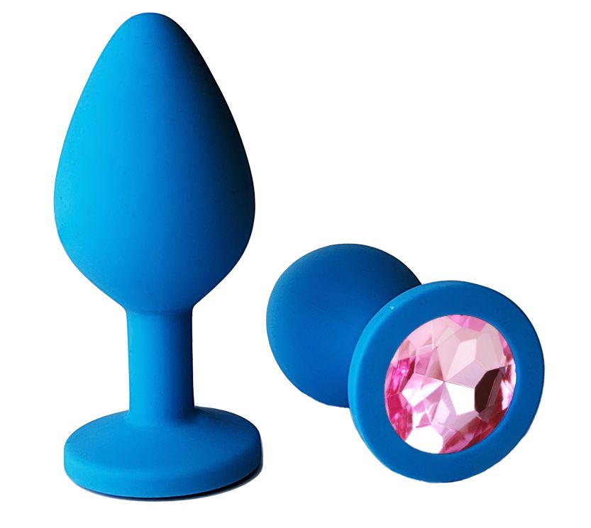 Голубая анальная пробка с нежно-розовым кристаллом - 8 см.