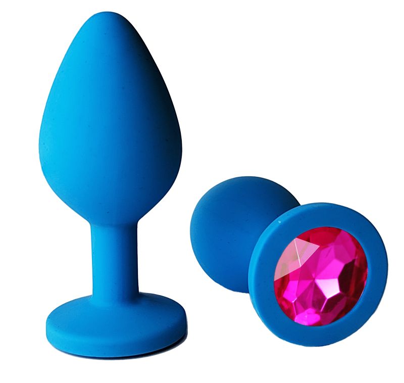 Голубая анальная пробка с розовым кристаллом - 8 см.
