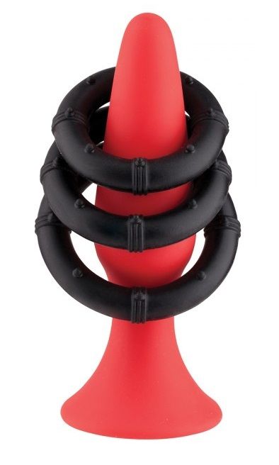 Красный плаг для анальной стимуляции из силикона. В наборе 3 черных силиконовых кольца, которые можно использовать на пенисе и мошонке. Диаметр колец - 3, 3,5 и 4 см.