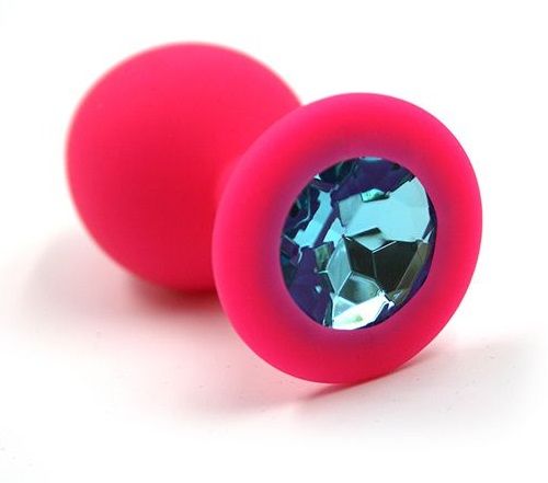 Розовая силиконовая анальная пробка с голубым кристаллом - 7 см.
