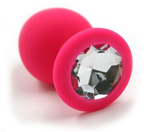 Розовая силиконовая анальная пробка с прозрачным кристаллом - 7 см.