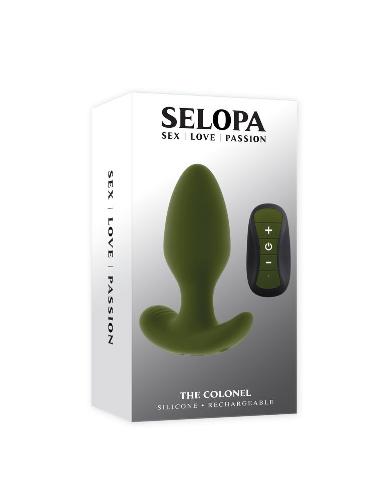 The Colonel — это массивная вибрирующая пробка с дружелюбной округлой формой и суженным круглым кончиком для плавного введения. Её мощный мотор управляется с помощью пульта дистанционного управления или кнопки на широком основании.