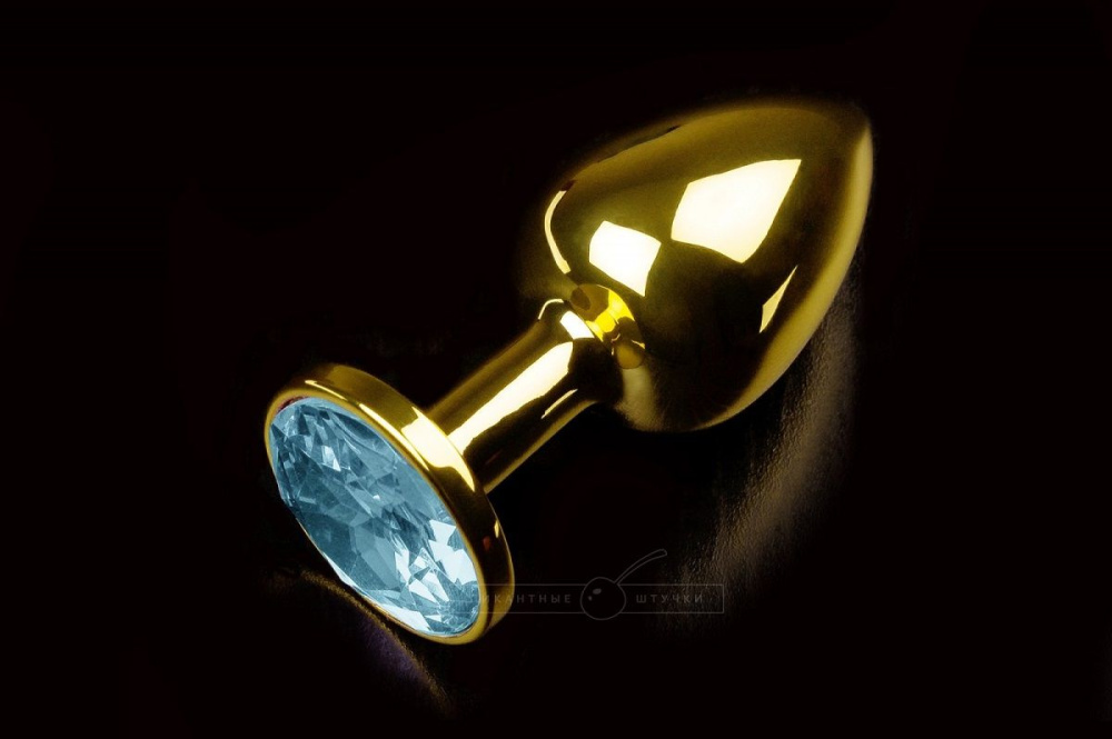 Купить Маленькая золотистая анальная пробка с голубым кристаллом - 7,5 см. Пикантные штучки по лучшей цене с доставкой - секс-шоп Ynunu.ru