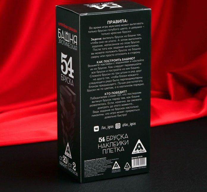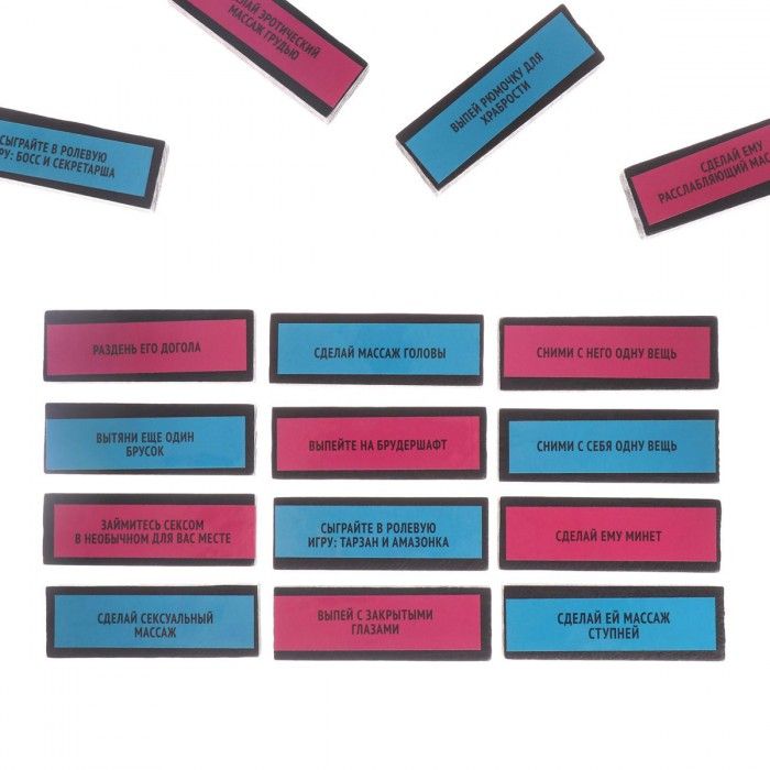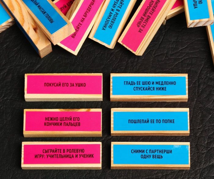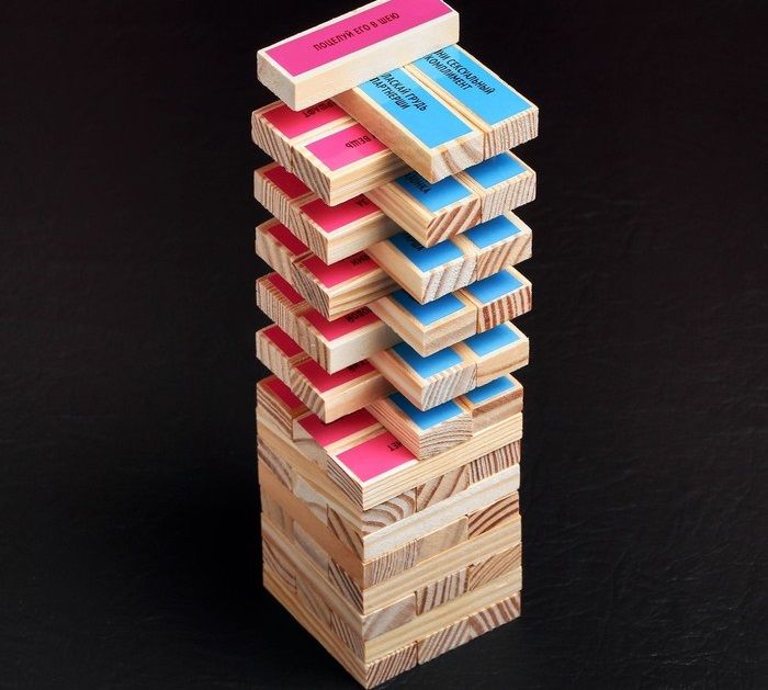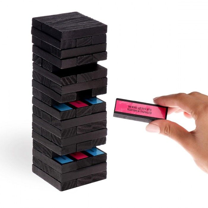 Ну а теперь, самое интересное. Мужчина вытягивает из башни только голубые бруски, ну а дама – только красные. Зачитывайте задание с вытащенного бруска и выполняйте его. Страстные поцелуи, нежные поглаживания и даже ролевые игры. Ну а плетка, станет отличным дополнением к вашим играм.