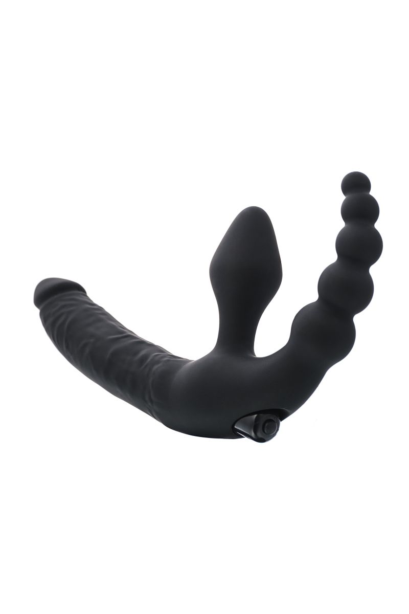 Чёрный безремневой страпон с вибрацией и анальным отростком