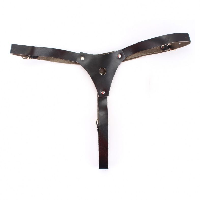 Трусики выполнены из натуральной кожи черного цвета. Спереди крепится штырек харнесс для насадок (входит в комплект). Изделие фиксируется ремнями и пряжками, позволяющими подобрать нужный размер (S-L). Аккуратные, стильные трусики помогут воплотить задуманное в реальность. Ширина ремешков - 2 см.