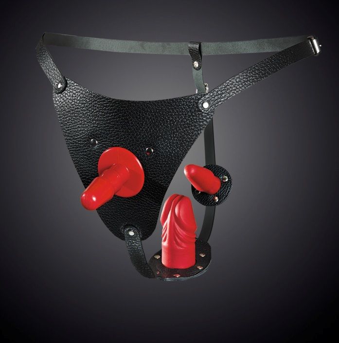 Трусики изготовлены из натуральной кожи. При производстве используется никелированная фурнитура. Размер регулируется ремешками, которые крепятся на бёдрах (от 42 до 50 размера). В комплект входит съёмный пластиковый плаг для насадок, съёмный фаллоимитатор, а также съёмная анальная пробка. Подходит для использования как мужчиной, так и женщиной. Длина съемного фаллоимитатора - 8 см., диаметр - 3,5 см.
