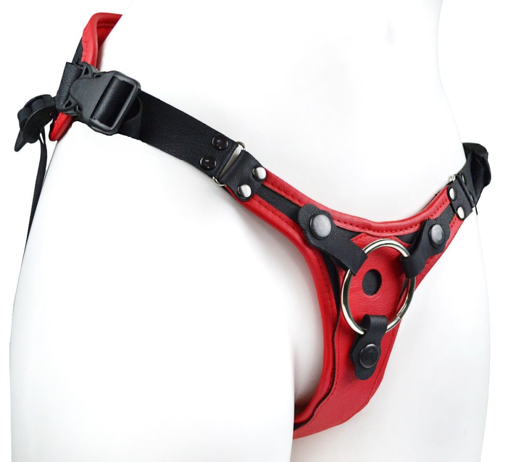 Красно-черный женский пояс с 2 способами крепления насадок и вагинальной пробкой