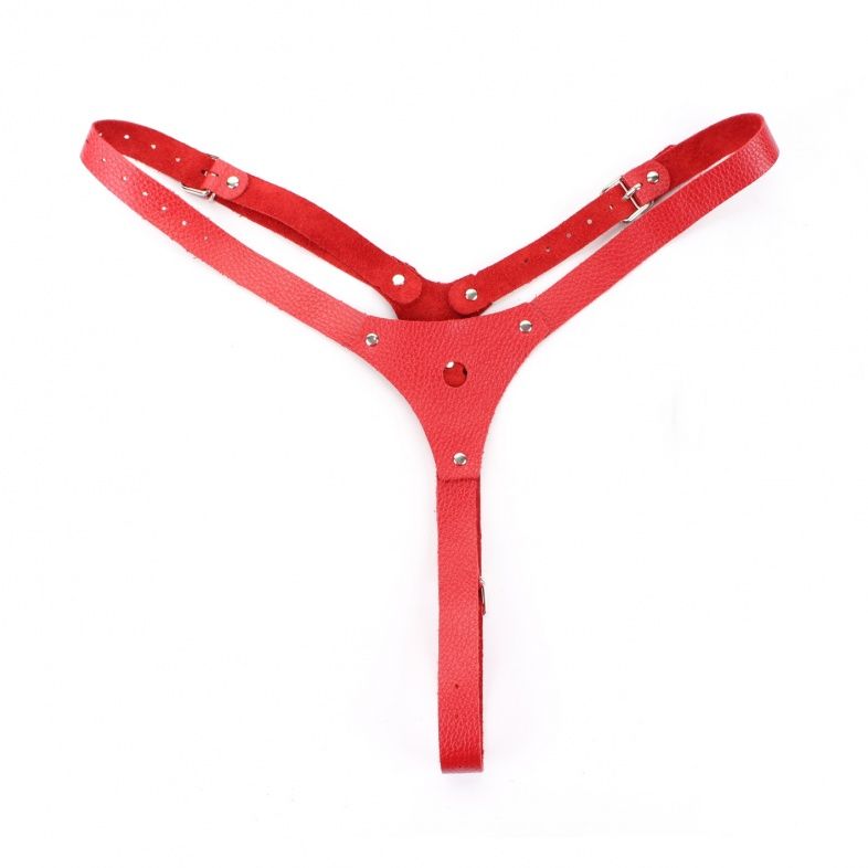 Трусики выполнены из натуральной кожи красного цвета. Спереди крепится штырек харнесс для насадок (входит в комплект). Изделие фиксируется ремнями и пряжками, позволяющими подобрать нужный размер (S-L). Аккуратные, стильные трусики помогут воплотить задуманное в реальность. Ширина ремешков - 2 см.