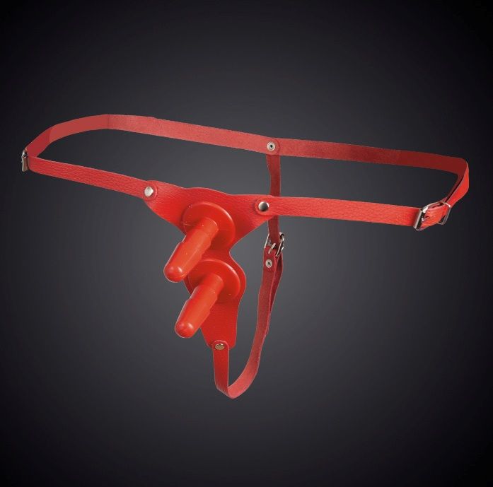 Красные кожаные универсальные трусики с двумя  штырьками для насадок
