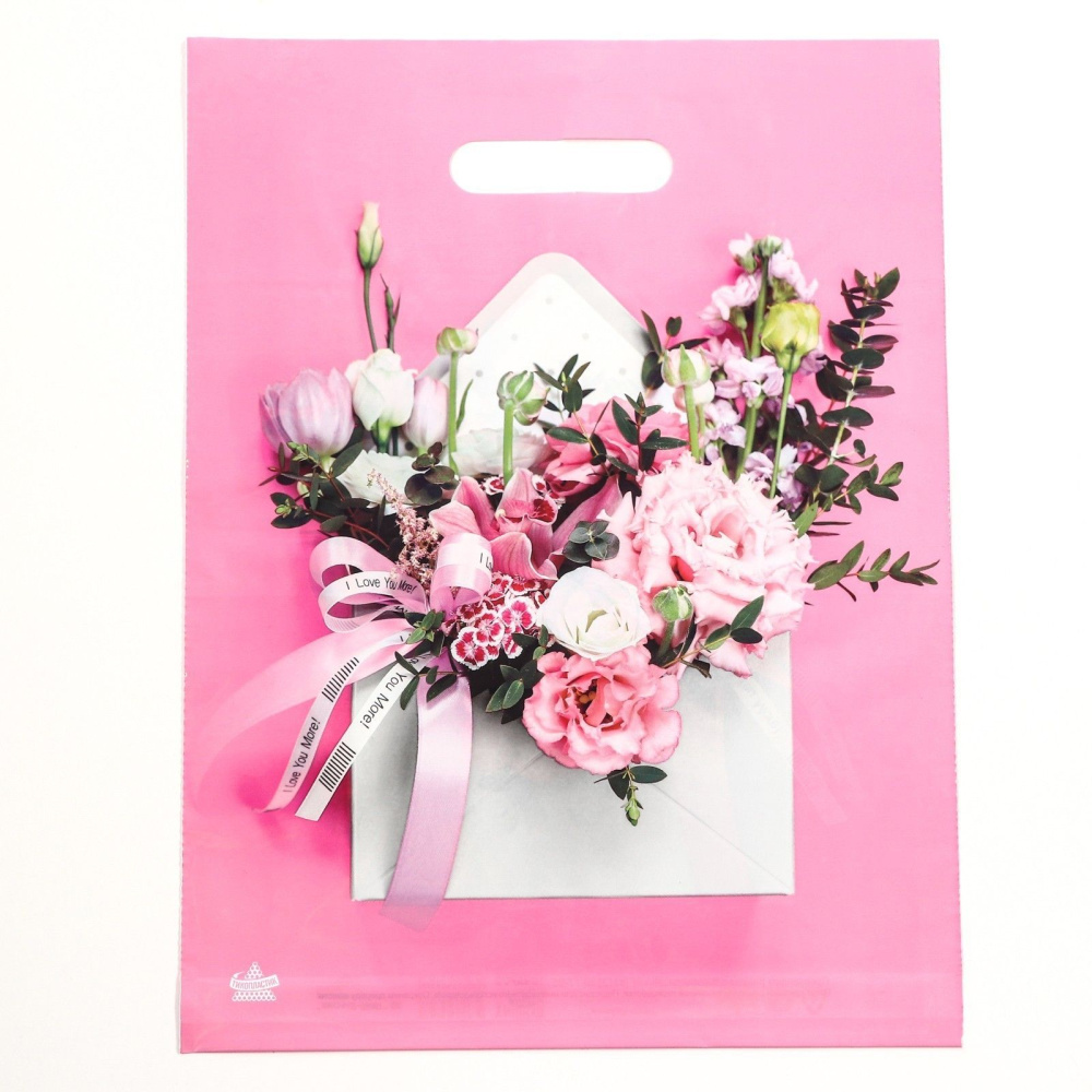 Розовый пакет с цветочным принтом и вырубной ручкой (40х31 см)
