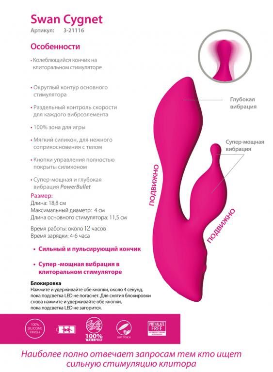 Cygnet - это игривая невинность,но первое впечатление может быть обманчивым. Изогнутая форма Cygnet позволит воздействовать на самые чувствительные участки,а его кончик поможет вам испытать невероятно насыщенные ощущения.