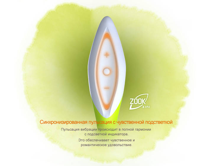 ZINI ZOOK - первый эргономичный Хай-тек нового поколения с уникальным изгибом 23,5 градуса и объемной формой, создающей ощущение заполненности. В дизайне использован мотив тропического бамбука, листок которого нежно ласкает вульву. Каждый из 15 вариантов вибрации и пульсации соответствуют определённому цвету, что позволяет установить любимый режим даже в темноте. Полностью заряженный аккумулятор рассчитан на 4 часа непрерывной работы, зарядное устройство в комплекте. Дизайнерская упаковка делает ZINI роскошным подарком. Длина - 20,2 см.