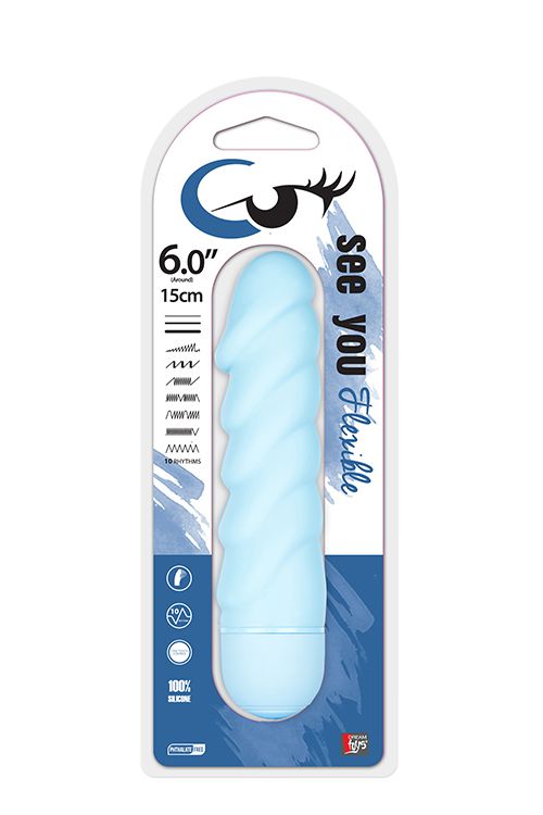 Голубой вибратор со спиралевидным рельефом SEE YOU FLEXIBLE. 10 режимов работы. Водонепроницаемый.