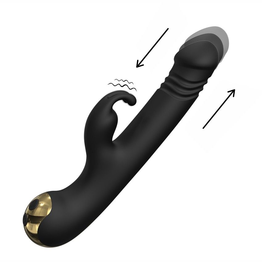 Оригинальный вибромассажёр с вибрацией и возвратно-поступательными движениями внесёт яркость и разнообразие в интимную жизнь одинокой дамы или пары. 9 режимов вибрации, 9 режимов возвратно-поступательных движений. Может использоваться для прелюдии или усилить удовольствие во время секса. Разнообразные режимы вибрации и возвратно-поступательных движений повысят уровень наслаждения. Специальный отросток в виде кролика будет стимулировать клитор.