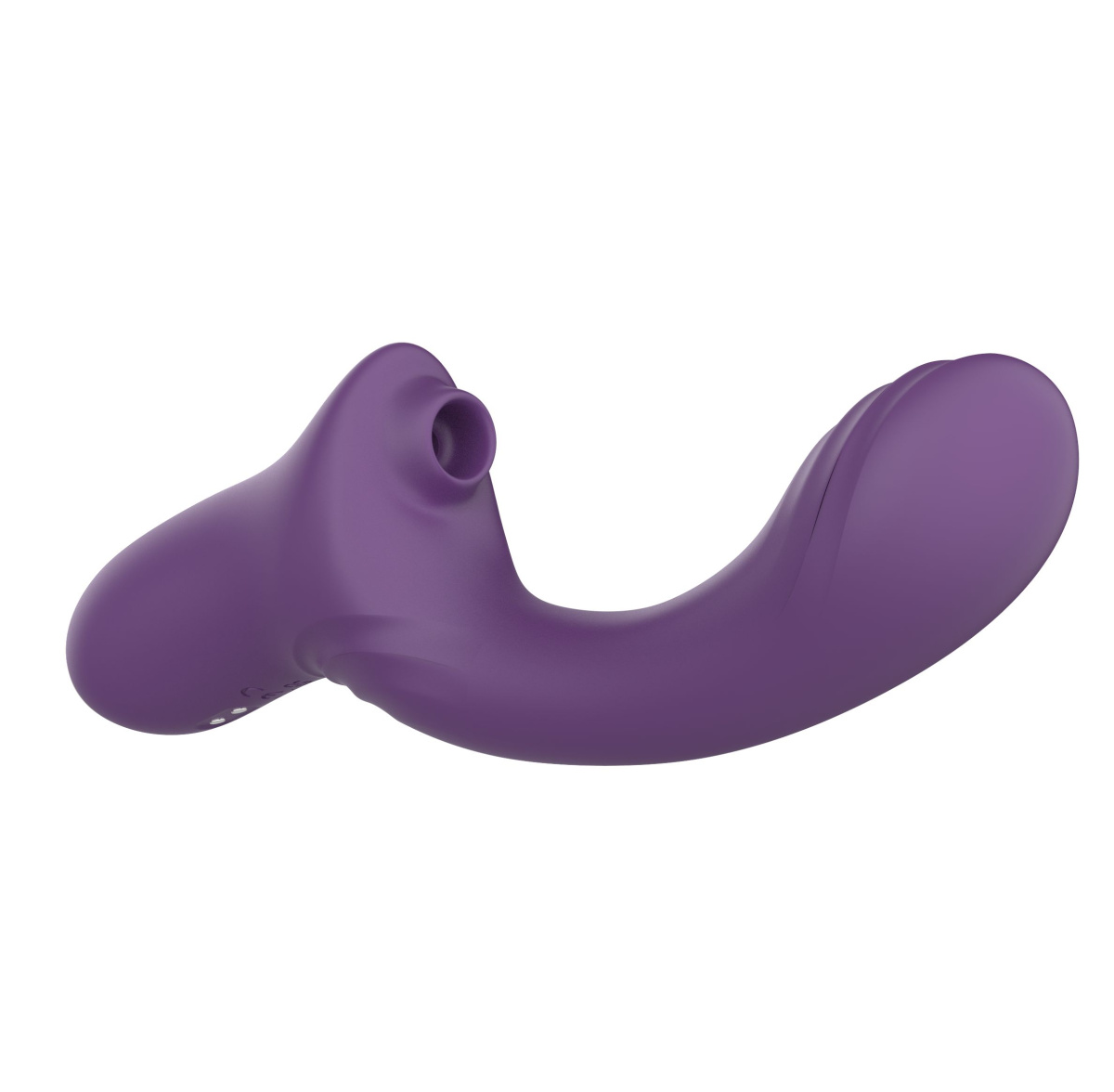 Фиолетовый вагинально-клиторальный вибратор. 10 режимов вибрации и 10 режимов посасывания в клиторальном отростке. Рабочая длина - 15,5 см.